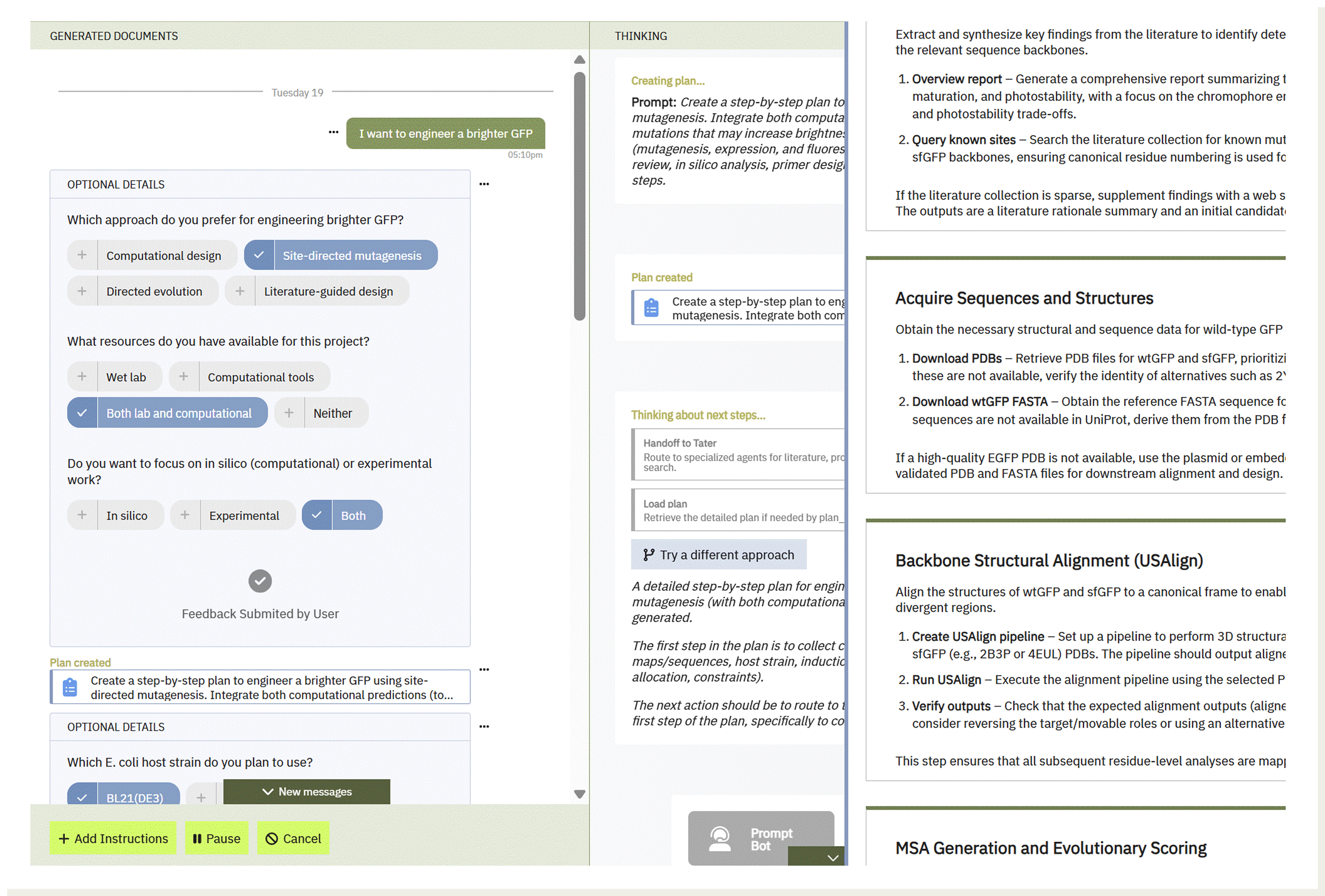 Designing new experiments typically requires days or weeks of manual effort—reviewing literature, designing constructs, enumerating variants, drafting protocols, and preparing analysis pipelines. Even for a simple idea like “make GFP brighter,” this process can be slow, fragmented, and error-prone. Researchers spend their time on protocol design, not scientific discovery.