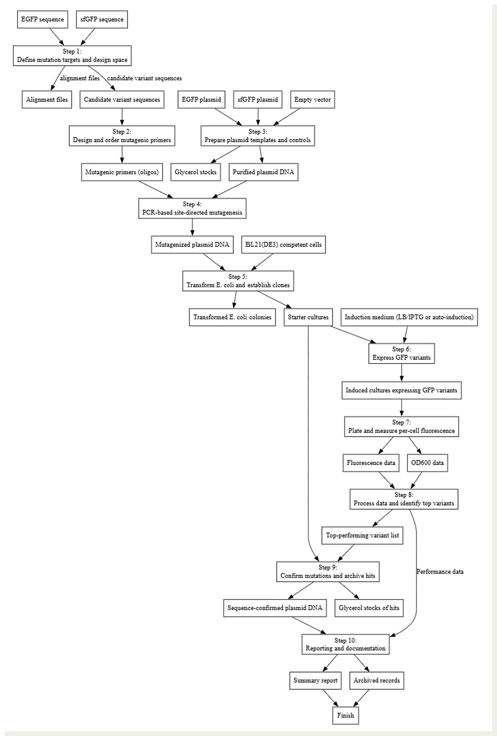 - Variant library enumerated: Codon-optimized set including WT, F64L, S65T, Y145F, N149K, and A206K.
