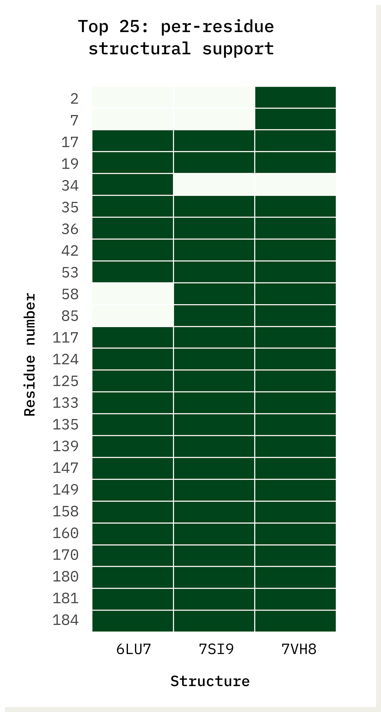 - Catalytic core: Critical residues like His41, Cys145, and Gly143 showed no tolerated single-base changes—confirming strong evolutionary constraints.